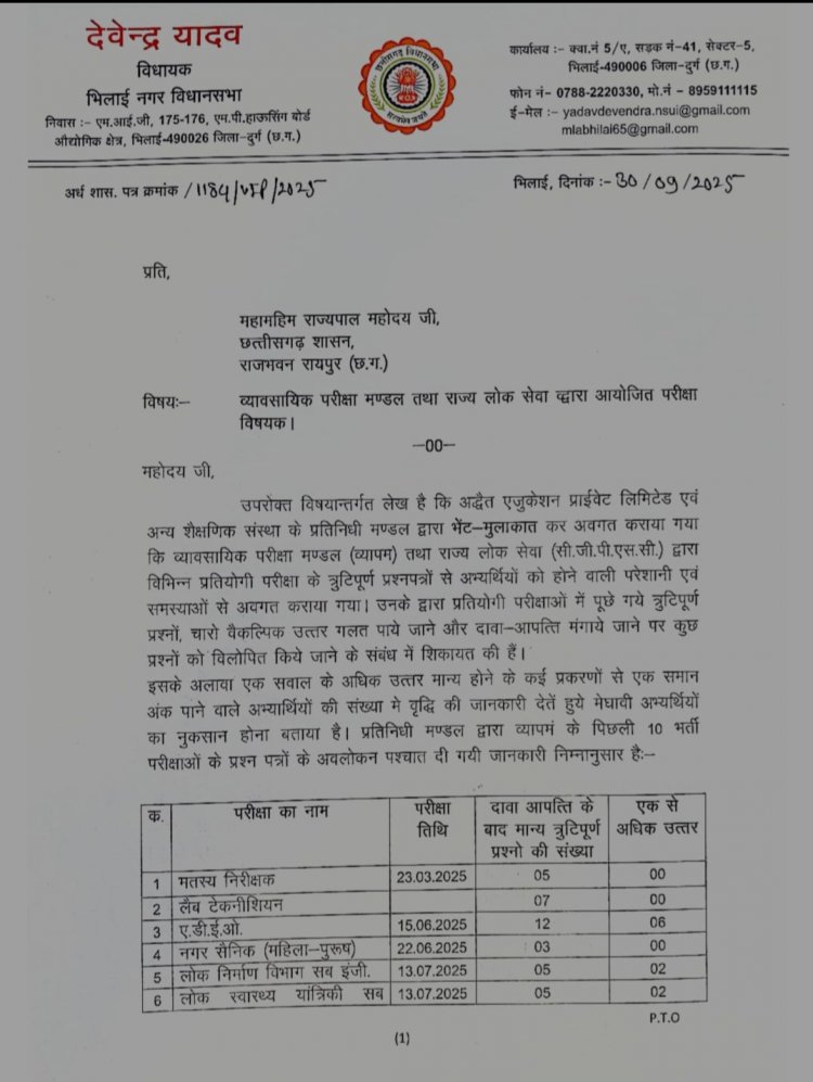 व्यापम और पीएससी की परीक्षाओं में त्रुटिपूर्ण प्रश्न पत्रों पर उठे सवाल, विधायक देवेंद्र यादव ने राज्यपाल से की शिकायत