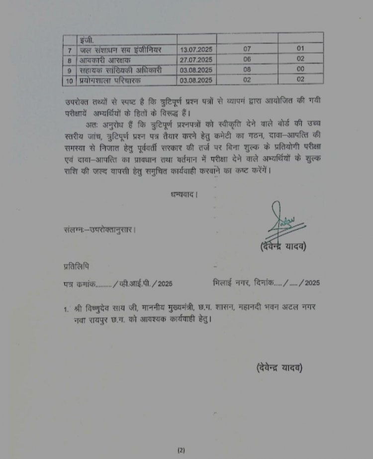 भिलाई। प्रदेश में प्रतियोगी परीक्षाओं की विश्वसनीयता पर एक बड़ा सवाल खड़ा हो गया है। व्यावसायिक परीक्षा मण्डल (व्यापम) और राज्य लोक सेवा आयोग (पीएससी) द्वारा हाल ही में आयोजित विभिन्न परीक्षाओं में बार-बार त्रुटिपूर्ण प्रश्न पत्र सामने आ रहे हैं। इस गंभीर मुद्दे को भिलाई नगर विधायक देवेंद्र यादव ने प्रमुखता से उठाते हुए राज्यपाल को पत्र लिखा है। उन्होंने इसे लाखों युवाओं के भविष्य से खिलवाड़ बताया है और त्वरित कार्रवाई की मांग की है।विधायक द्वारा भेजे गए पत्र में कहा गया है कि बीते कुछ महीनों में आयोजित करीब 10 भर्ती परीक्षाओं—जिनमें मत्स्य निरीक्षक, लैब टेक्निशियन, एसडीओ, लोक निर्माण विभाग, जल संसाधन विभाग, सहायक सांख्यिकी अधिकारी और प्रयोगशाला परीक्षक जैसी महत्वपूर्ण परीक्षाएं शामिल हैं—में बड़ी संख्या में गलत, डुप्लीकेट या एक से अधिक सही उत्तर वाले प्रश्न पूछे गए। केवल हाल की परीक्षाओं में ही 60 से अधिक त्रुटिपूर्ण प्रश्न सामने आए हैं। इनसे न केवल परीक्षार्थियों में भ्रम की स्थिति बनी, बल्कि कई अभ्यर्थियों को योग्य अंक से वंचित होना पड़ा।देवेंद्र यादव ने पत्र में उल्लेख किया है कि इस प्रकार की लापरवाही प्रतियोगी परीक्षाओं की विश्वसनीयता और पारदर्शिता पर गहरा असर डालती है। उन्होंने मांग की है कि प्रश्न पत्र तैयार करने और उसकी जांच के लिए उच्च स्तरीय विशेषज्ञ समिति गठित की जाए ताकि भविष्य में इस तरह की गड़बड़ियां न हों। साथ ही, जिन परीक्षाओं में त्रुटिपूर्ण प्रश्न पूछे गए हैं, उनमें अभ्यर्थियों से वसूली गई फीस वापस की जाए और यदि पुनः परीक्षा कराना आवश्यक हो तो वह निशुल्क आयोजित की जाए।यादव ने कहा है कि यह केवल प्रश्नों की त्रुटि का मामला नहीं है, बल्कि प्रदेश के लाखों युवाओं की मेहनत और करियर का सवाल है। उन्होंने राज्यपाल से आग्रह किया है कि मामले को गंभीरता से लेते हुए व्यावसायिक परीक्षा मण्डल और लोक सेवा आयोग को कठोर निर्देश दिए जाएं।पत्र की एक प्रति मुख्यमंत्री को भी भेजी गई है, ताकि शासन स्तर पर तुरंत आवश्यक कार्रवाई सुनिश्चित की जा सके।
