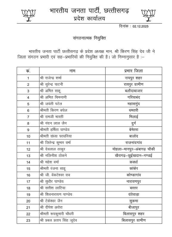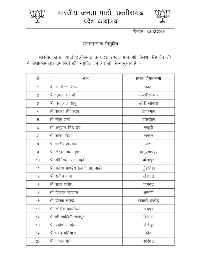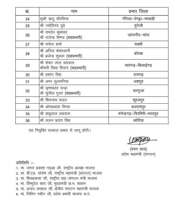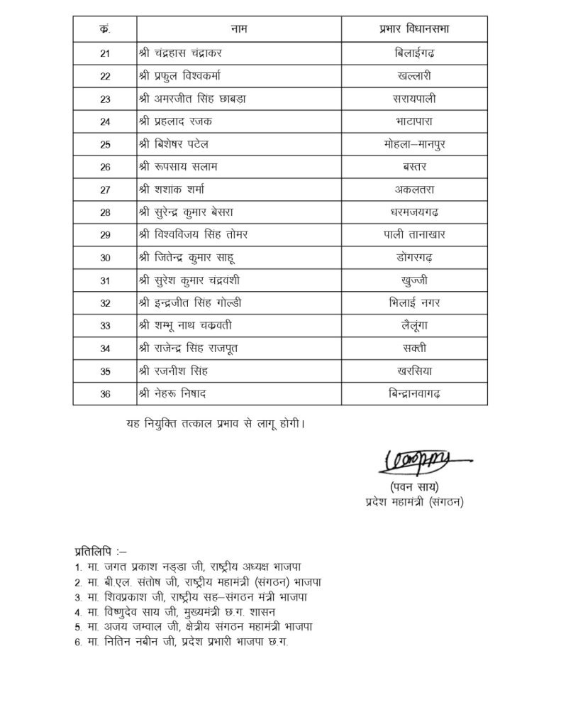 रायपुर/ भारतीय जनता पार्टी के प्रदेश अध्यक्ष किरण सिंह देव ने विधानसभावार प्रभारियों के साथ जिला संगठन प्रभारी और सह-प्रभारियों की नियुक्ति की है. एक तरफ जहां 36 विधानसभा प्रभारियों के साथ 36 जिला संगठन प्रभारियों की नियुक्ति की गई है.