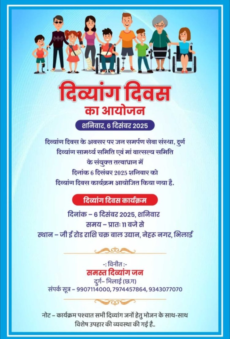 इस बात एवं उद्देश्य को ध्यान में रखते हुए जन समर्पण सेवा संस्था, दुर्ग, दिव्यांग सामर्थ्य समिति एवं मां वात्सल्य दिव्यांग सेवा संस्थान के संयुक्त तत्वाधान में दिनांक 6 दिसंबर 2025 शनिवार को दिव्यांग दिवस कार्यक्रम आयोजित किया गया है