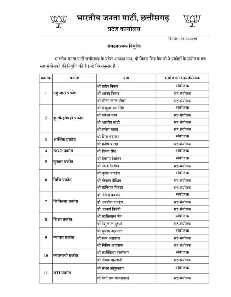 भिलाई। भारतीय जनता पार्टी छत्तीसगढ़ प्रदेश संगठन की ओर से 2 दिसंबर को 17 प्रकोष्ठ के संयोजकों एवं सह संयोजकों की नियुक्तियां की गई है। जिसमें भिलाई संगठन जिले के पूर्व मंडल में निवासरत दिनेश सिंह को गैर सरकारी संगठन (एनजीओ) प्रकोष्ठ के प्रदेश संयोजक का दायित्व दिया गया है। दिनेश सिंह ने इस जिम्मेदारी के लिए मुख्यमंत्री विष्णुदेव साय, भाजपा प्रदेश अध्यक्ष किरण सिंहदेव, संगठन महामंत्री पवन साय का आभार जताया है। इस नियुक्ति पर सांसद विजय बघेल, पूर्व विधानसभा अध्यक्ष प्रेम प्रकाश पांडे, वैशाली नगर विधायक रिकेश सेन और जिला अध्यक्ष पुरुषोत्तम देवांगन ने बधाई दी हैl