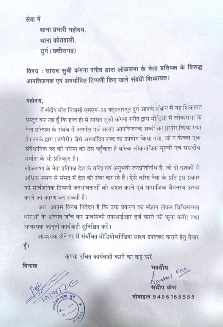 दुर्ग : राहुल गांधी के खिलाफ आपत्तिजनक टिप्पणी पर कंगना रनौत के विरुद्ध शिकायत, एफआईआर की मांग